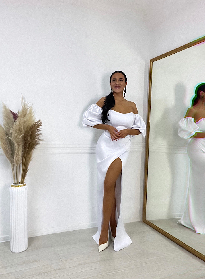 Korset sa zavodljivim puf rukavima od satena koji se mogu skinuti i donji deo suknja sa falticama koje pristaju svim tipovima zenakog tela.